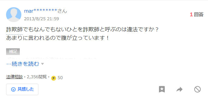 ご安心ください、どうやら理由なく悪意を持って詐欺師呼ばわりすると名誉棄損罪になるそうです。