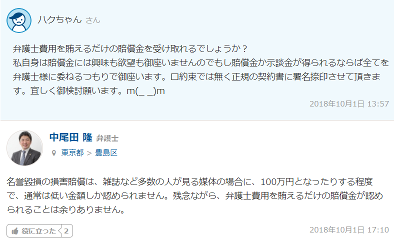 例えばココナラのQ&Aでは以下のような質問が投稿されていますが、なんと現役の弁護士が答えていました。