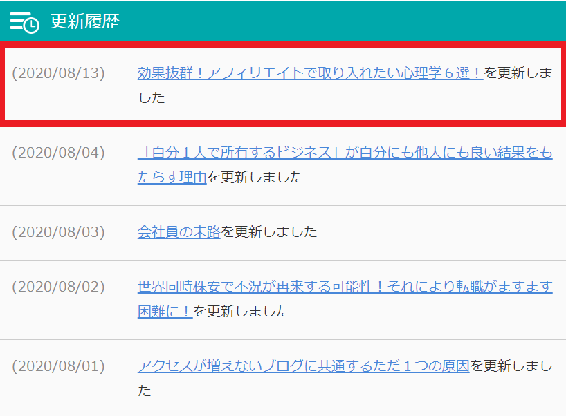 例えば効果抜群!アフィリエイトで取り入れたい心理学5選!という記事を2020年8月13日にリライトしたとします。